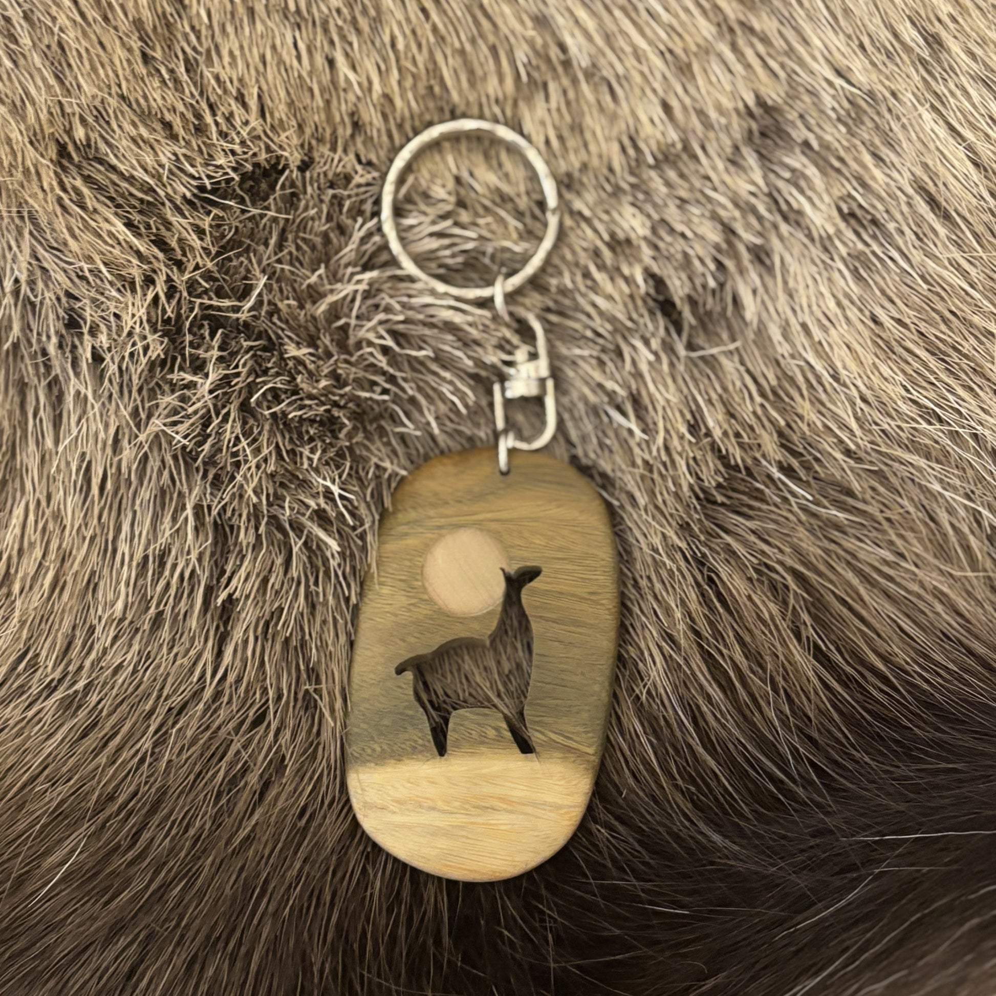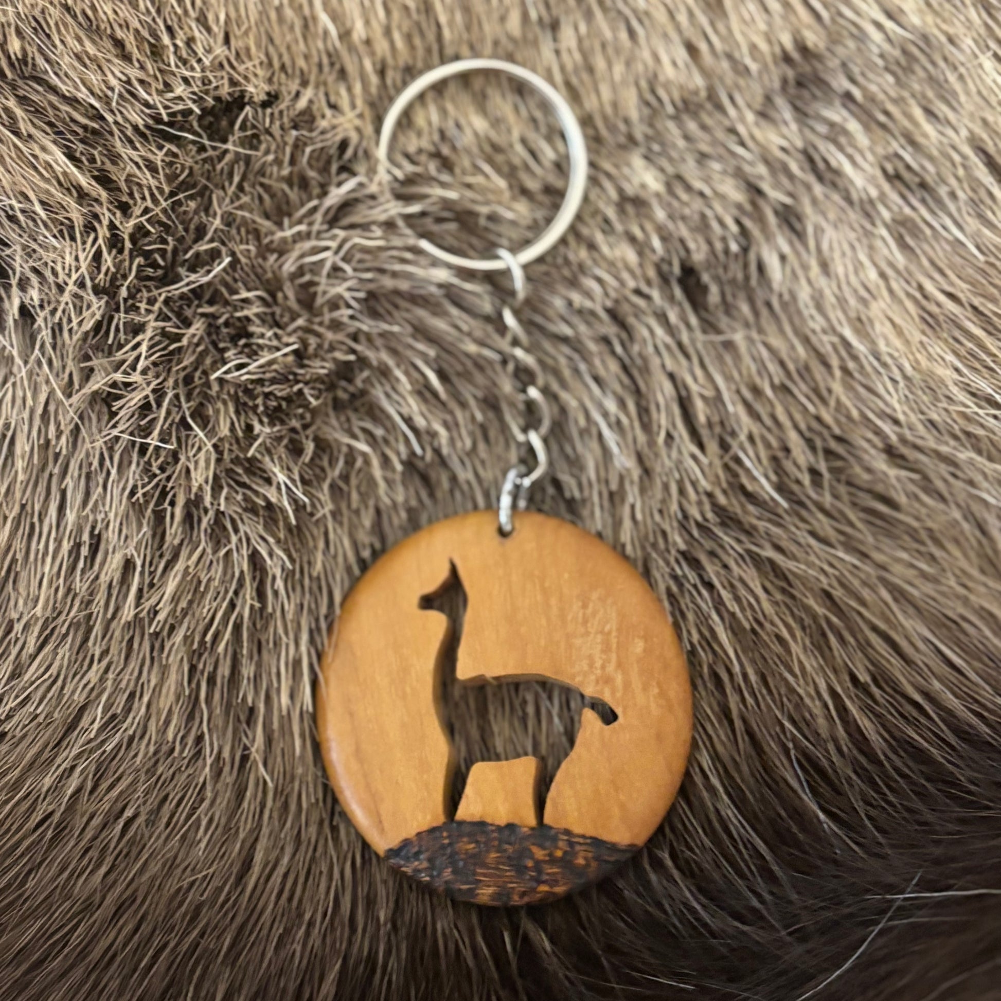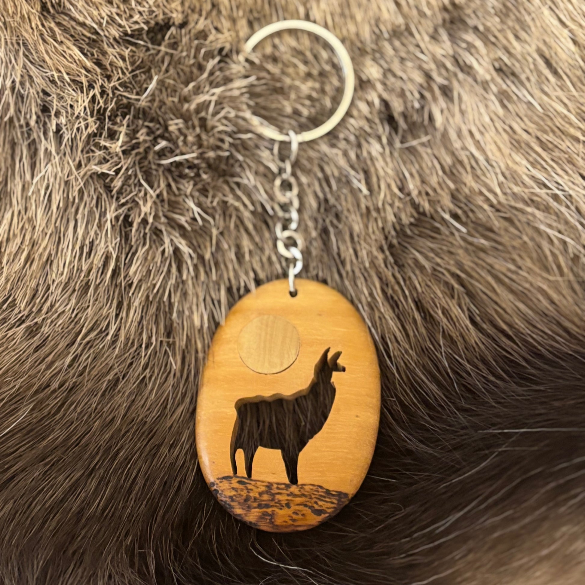 Käsintehty Argentiinassa valmistettu avaimenperä. Avaimenperässä on puuhun kaiverrettu laama.