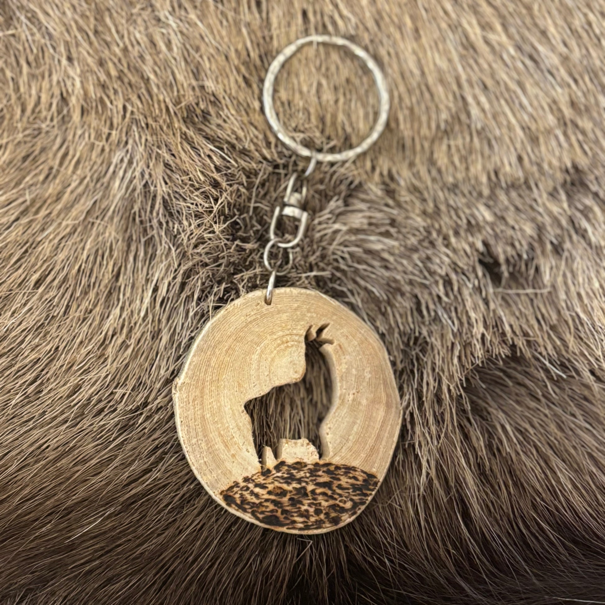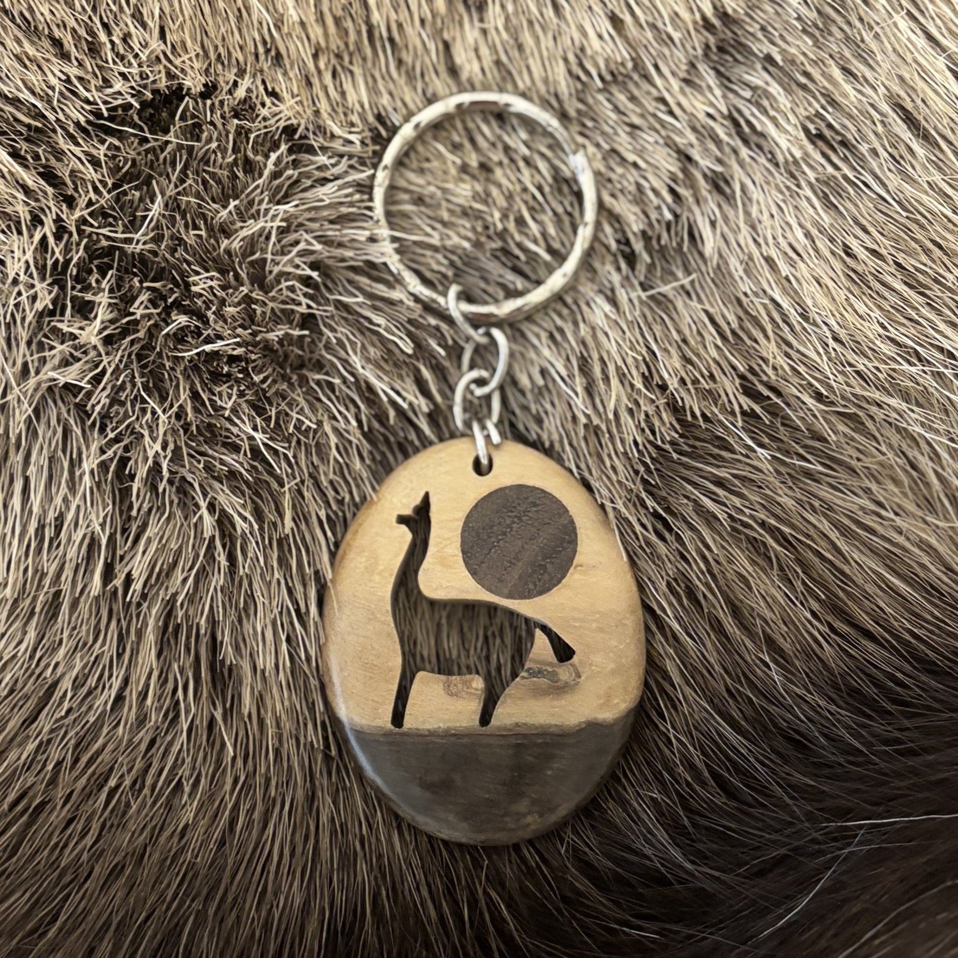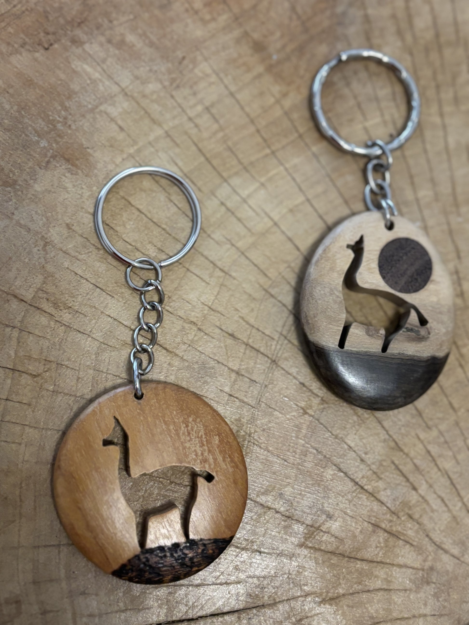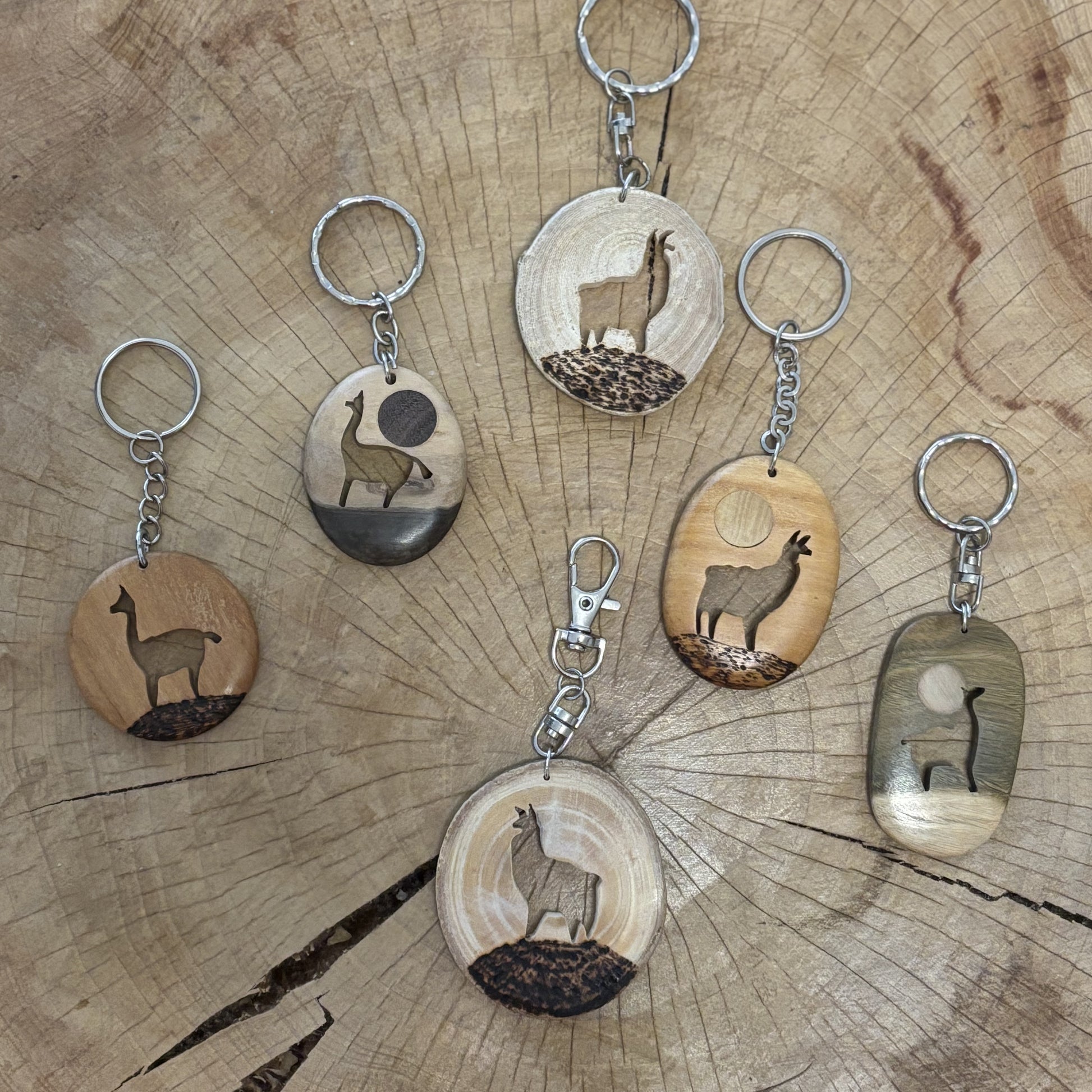 Käsintehty Argentiinassa valmistettu avaimenperä. Avaimenperässä on puuhun kaiverrettu laama.