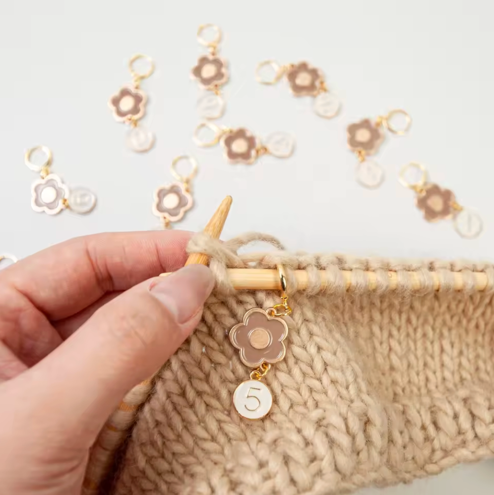 Paketissa on kymmenen kullanväristä silmukkamerkkiä, joissa on kaunis kukkakuvio ja numerot 0–9. Silmukkamerkkien avulla voit helposti merkitä neule- tai virkkuutyöhön kohdat, jotka vaativat erityistä huomiota – esimerkiksi lisäysten, kavennusten tai kerroksen aloituskohdan tai määrän. Voit käyttää numeroita järjestyksessä tai oman työsi tarpeen mukaan.